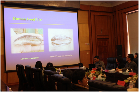 2014年12月5日上午,泰国农业大学水产学院院长SuriyanTunkijjanukij教授带领该院5位教师及泰国农业部水产部门2名官员来访中国海洋大学食品科学与工程学院,双方在鱼山校区胜利楼一楼会议厅举办了“中-泰”国际合作项目-“海参养殖与加工技术”研讨会。食品科学与工程学院院长薛长湖教授、副院长牟海津教授、王富龙主任、梁兴国教授、张朝辉教授、院外事办主任唐庆娟副教授、赵雪副教授、董士远副教授,水产学院曾晓起教授,泰国留学生Miss Jitima Suwanmala和学生代表武娟、张琪、路上云、刘芳、石红杰等出席了本次研讨会。