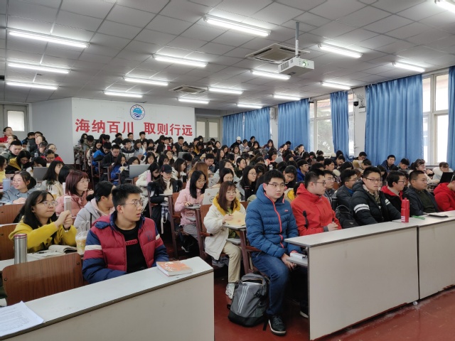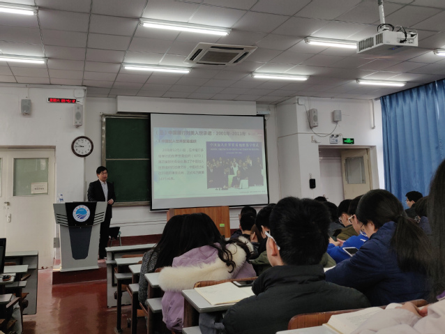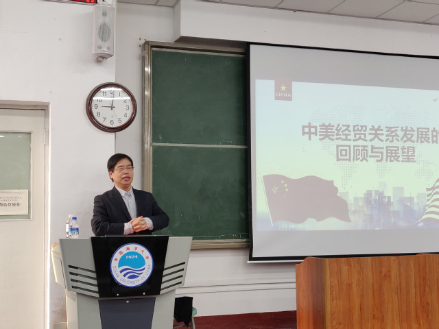 本站讯 12月7日上午,食品科学与工程学院院长薛长湖主讲的题为“中美经贸关系发展的回顾和展望”形势与政策课在鱼山校区新教学楼顺利开讲。