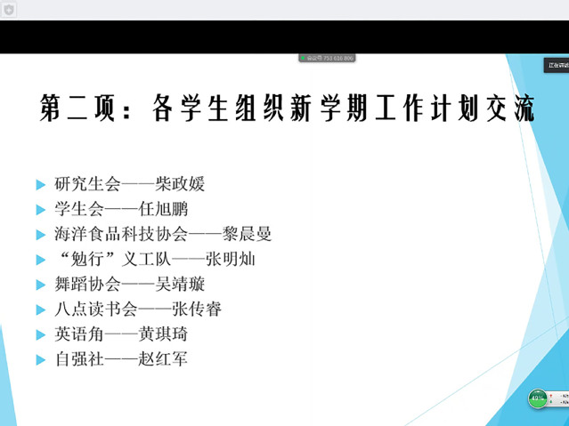 在随后进行的学生组织新学期工作计划交流部分,研究生会、学生会、海洋食品科技协会、“勉行”义工队等组织的主要负责人就当前工作进展和新学期工作计划进行交流汇报与会老师们根据各社团现存的问题和未来发展给出了中肯的意见和建议,并为当前特殊时期社团线上活动的开展提供了新思路。程振明提出,社团工作实打实地服务同学,主动靠近学生,贴近学生需求从而真正发挥学生组织的作用;此外,在这段特殊时期,各学生组织应该把握难得的空闲时期进行内部规范化和标准化建设,将学生组织建设推向新台阶。