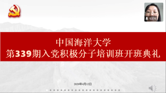 本站讯 4月12日下午,中国海洋大学第339期入党积极分子培训班开班典礼通过腾讯会议线上举行。食品科学与工程学院党委副书记程振明出席开班典礼,开班仪式由食品科学与工程学院辅导员张川主持,培训班全体学员参加。