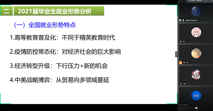 程振明展示了近两年毕业生的就业数据,近几年的就业率逐渐下降,也表明了近几年就业形势较为紧张。同时,根据往年的就业数据以及当前的具体情况,提出2021届毕业生就业形势特点