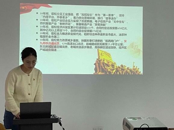 蔡梦婷同志表示我国已经实现全面建成小康社会的目标,并取得“两个确立”重大政治成果。在新时代十年来,中国特色社会主义制度更加成熟,制度优势更加彰显。李颖同志在分享中讲到中国共产党的领导是中国特色社会主义最本质的特征,做好中国事,关键在党。章晋敏同志表示新时代创造的伟大成就,实现的伟大变革,最根本在于有习近平总书记作为党中央的核心,在于有习近平新时代中国特色社会主义思想的科学指引。刘艳星同志通过一个简短震撼的视频让在场同志了解到这非凡的十年创造的伟大成就。