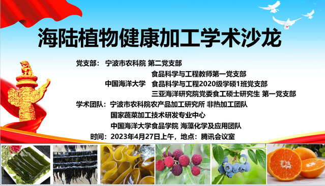 本站讯 为进一步学习贯彻党的二十大精神,加强学术交流,4月27日,中国海洋大学食品科学与工程学院海藻化学及应用研究室付晓婷教授团队与宁波市农科院农产品加工所首席专家凌建刚研究员团队开展了支部联合党建活动及“海陆植物健康加工”学术沙龙。