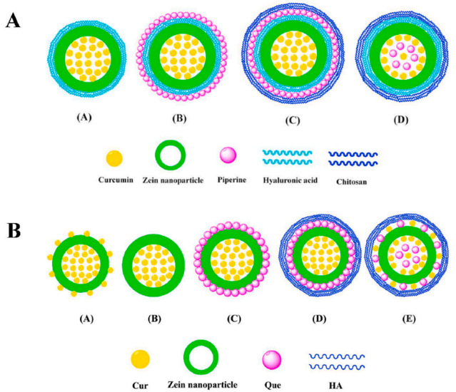 Fig. 1. Representative cases of co-delivery of bioactive compounds in different locations within a single carrier. (A) Co-delivery of curcumin and piperine by zein/ hyaluronic acid/chitosan nanoparticles. Adapted from Chen et al. (2019d). (B) Co-delivery of curcumin and quercetagetin by zein/hyaluronic acid nanoparticles. Adapted from Chen et al. (2019b).