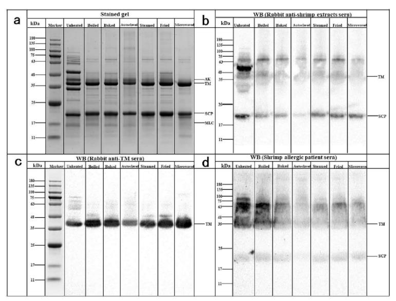值得注意的是,在各种热处理的虾可溶性蛋白中,虾原肌球蛋白(TM)和肌钙质结合蛋白(SCP)仍然具有较高的IgG/IgE活性。根据TM抗血清western blotting和间接ELISA结果,在热处理的虾TM中甚至出现更高的IgG反应性。虾TM和SCP在各种烹饪方法后保持其IgE/IgG结合能力,因此很可能是诱发消费者对未处理和热处理虾的产生过敏反应的主要蛋白成分。