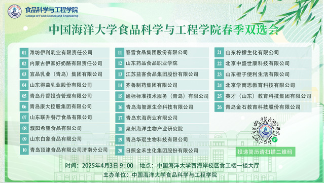 为深入贯彻党中央、国务院关于高校毕业生就业创业工作的决策部署,抢抓春季促就业关键期,推进2025届毕业生高质量就业。中国海洋大学食品科学与工程学院于4月3日成功举办”山海之间 职等你来“2025届毕业生春季专场双选会。本次活动线上线下同步开展,为毕业生搭建起多元化求职平台,现场人头攒动,气氛热烈有序。