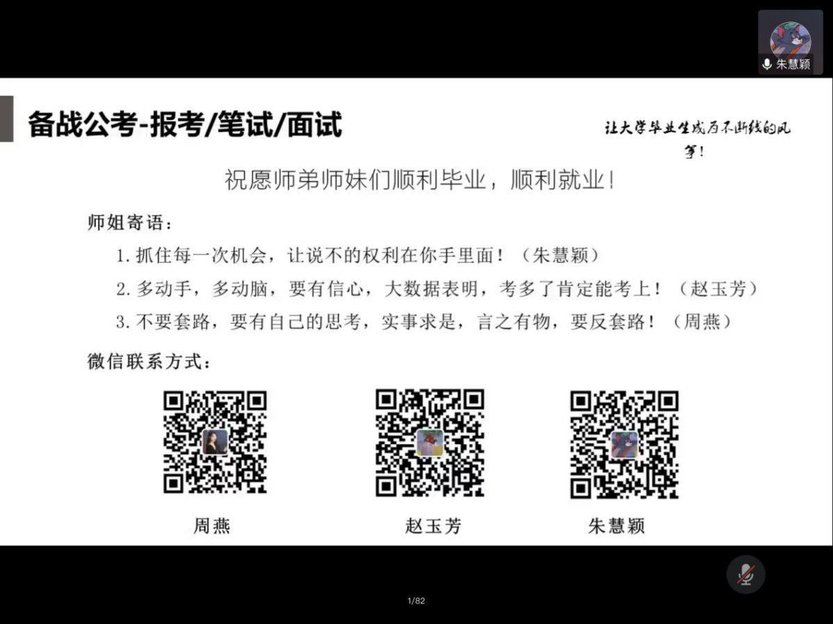 除了直接就业外,定向选调也是毕业生倾向选择的又一选择,三个选调上岸的师姐就报考、笔试、面试三个主题向同学们展开了分享。