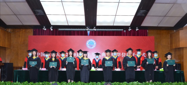 现场全体人员共同观看视频,聆听学校党委书记田辉、校长于志刚对全体2020届毕业生的嘱托。典礼后举行了毕业生学位授予仪式。食品科学与工程学院教授孟祥红、毛相朝分别主持毕业本科生学位授予仪式和毕业研究生学位授予仪式,毕业生8人一组,依次登台,副校长闫菊、学院学位委员会成员为毕业生颁发学位证书,并集体合影留念。