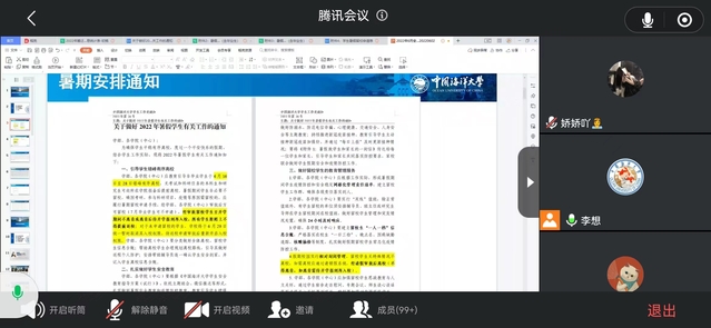 本站讯  为扎实做好学生暑假安全和疫情防控教育工作,进一步提高防护自救能力,616日,食品科学工程学院2020级硕士研究生年级大会在线上顺利举行,年级辅导员李想以及2020级全体硕士研究生参加了会议