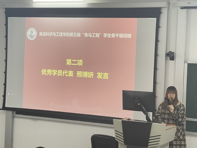 2020级海洋资源开发技术班邢博妍作为优秀学员代表发言,她按照时间线带领大家共同回归了本期“青马工程”培训班。邢博妍表示,通过本次培训班她意识到,学生干部首先是学生,其次才是干部,既要夯实专业基础,又要提升个人能力与修养,做好模范带头作用。