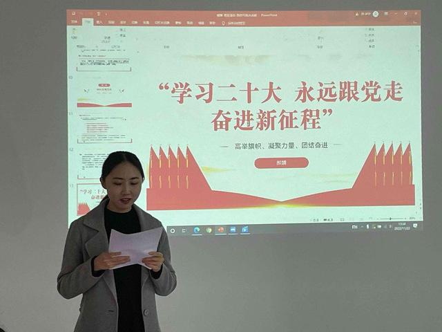 孙学宁同志从中国共产党第二十次全国代表大会的主题、新时代中国共产党的中心任务、党的二十大报告前三章节选三个方面讲述。首先会议明确了党的二十大的主题是高举中国特色社会主义伟大旗帜,全面贯彻新时代中国特色社会主义思想,弘扬伟大建党精神,自信自强、守正创新,踔厉奋发、勇毅前行,为全面建设社会主义现代化国家、全面推进中华民族伟大复兴而团结奋斗。其次,孙学宁指出中国共产党的中心任务就是团结带领全国各族人民全面建成社会主义现代化强国、实现第二个百年奋斗目标,以中国式现代化全面推进中华民族伟大复兴。最后,孙学宁从过去五年的工作和新时代的伟大变革、开辟马克思主义中国化时代化新境界、新时代新征程中国共产党的使命任务三小节中选出精华的部分给大家讲解,进一步加深了与会同志对党的二十大的了解。