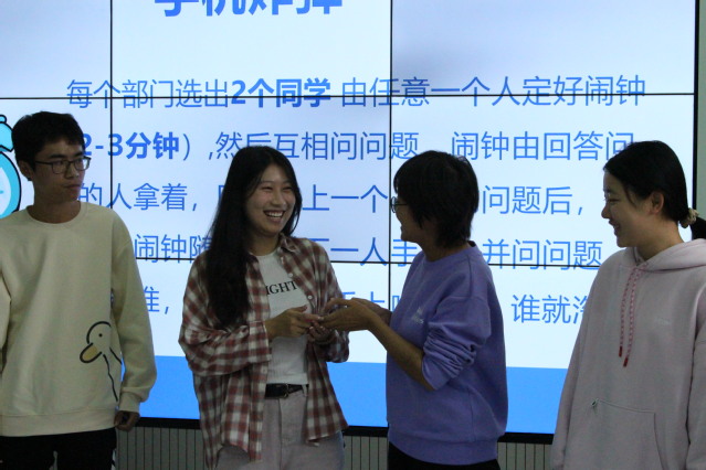 为了让同学们迅速熟悉并认知彼此,大会设有三个惊险刺激的破冰游戏,分别是记名字、闹钟炸弹和猜歌名。尤其在闹钟炸弹游戏中,一些意想不到的提问给大会带来了诸多笑点,在欢声笑语中大家拉近了彼此间的距离,同学们也不再拘束,大胆展示才艺。