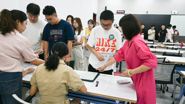 作为迎新的重点工作之一,新生学籍核验工作也有条不紊地开展。学院教学秘书杜亚楠、潘延君事先对志愿者开展培训,迎新现场逐一读取身份证、录入指纹、进行人脸识别,比对身份信息。在师生的共同努力下,学籍核验高效、顺利完成。