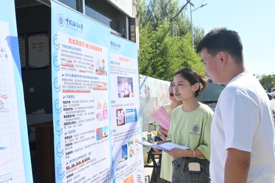清晨,泊里大集已经热闹非凡,实践团指导老师朱嘉铭带领团队成员早早地来到现场,精心布置着活动场地。十个主题鲜明的食品安全与营养相关知识展架依次排开,成为大集中一道亮丽的风景线。这些展架不仅涵盖食品储存、膳食营养搭配、认识食品添加剂、怎样吃海鲜更健康等生活中常见的营养与健康科普小知识,也包括对高血压、高血糖、痛风等老年人关注的疾病的食养方法,以图文并茂的形式生动地向人们展示了食品营养与安全知识。